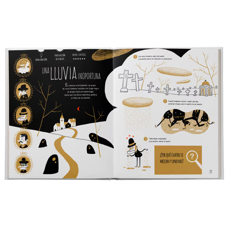 Sinopsis: Bienvenido al libro de los enigmas de misterio diviértete resolviendo esta recopilación de enigmas en los que practicarás dos maneras diferentes de pensar, algunos enigmas los resolverás empleando la lógica y otros, con tu imaginación. Podras jugar solo, por equipos o en familia. ¡conviértete en un auténtico detective, busca pistas, utiliza tu mente y resuelve el enigma!