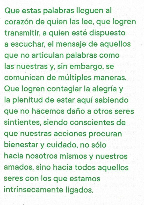 Por naturaleza, somos generosos, compasivos y equilibrados. Reconocer esta verdad elemental puede ayudarnos a reorientar nuestra existencia y recordar nuestra conexión con la Tierra. Esta cartilla es un llamado a abrazar la compasión por otros seres vivos y cambiar nuestra relación con el alimento; una invitación a honrar lo que comemos y comprender su valor sagrado; una exhortación urgente a reconocer que el ser humano necesita recapacitar y transformarse, y que es en el individuo y en sus acciones donde se gestan los cambios en la conciencia colectiva.